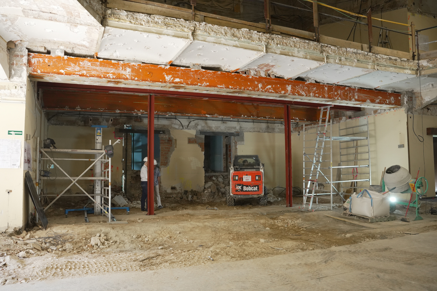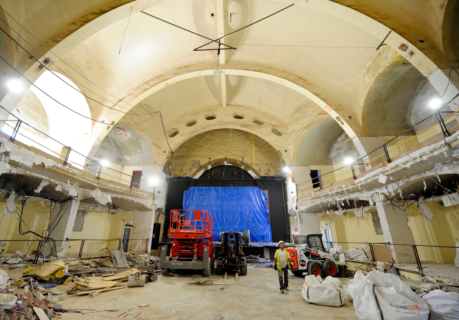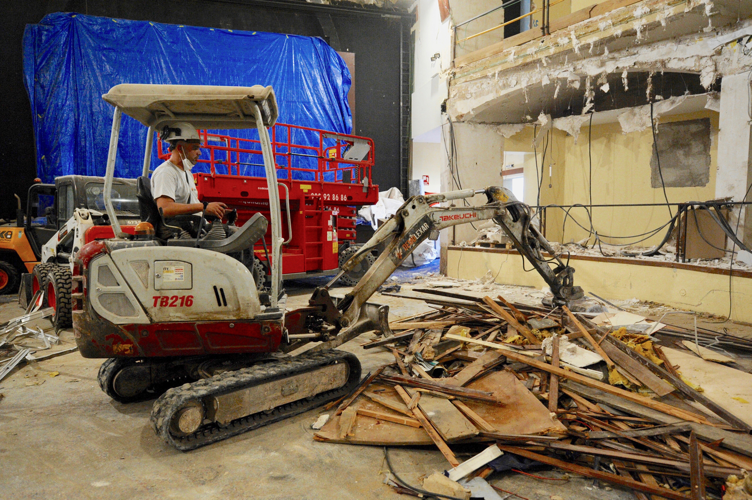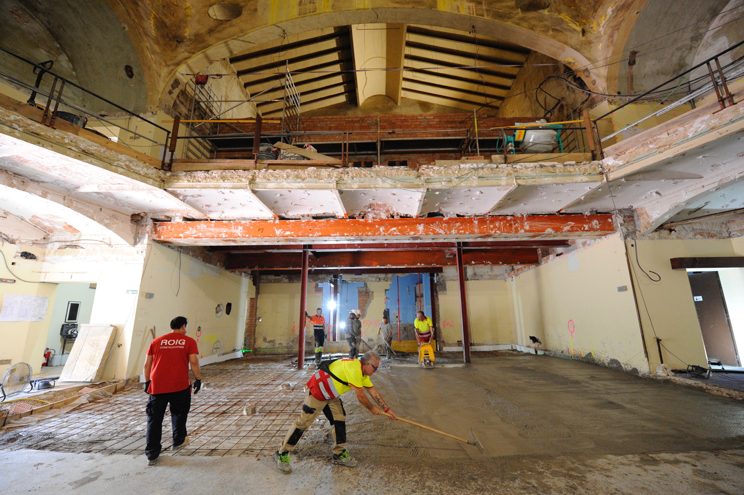 Les màquines van començat a operar a principis d’abril del 2024. Des d’aquell moment, s’ha retirat el fals-sostre que tapava les voltes, s’ha fet més gran la platea i s’ha completat el tancament de la nova sala de projecció, al primer pis. També s’han revestit les parets i s’ha pintat el saló.